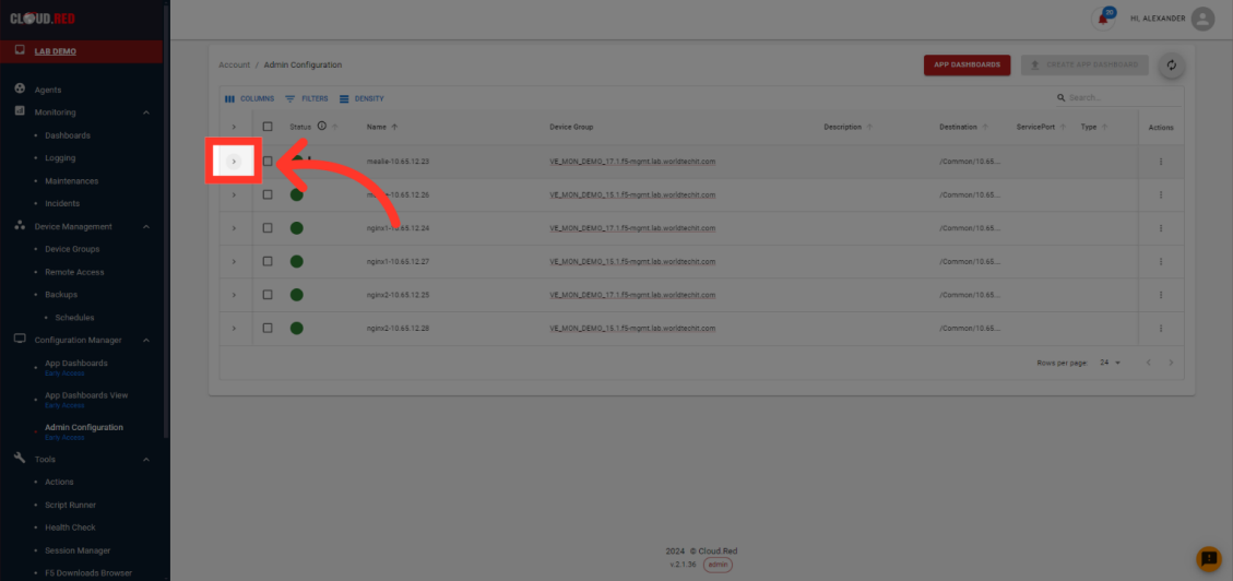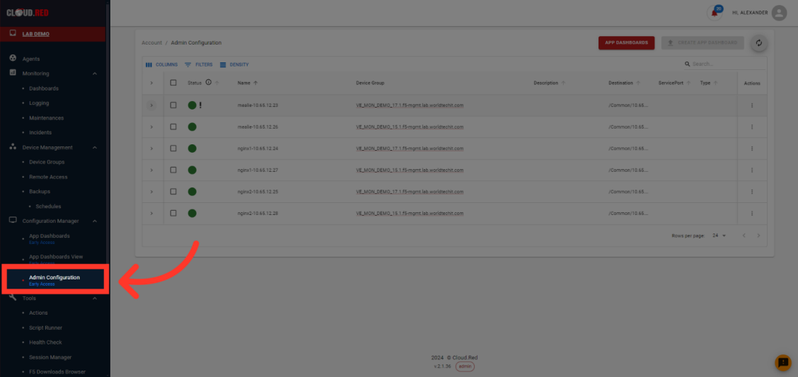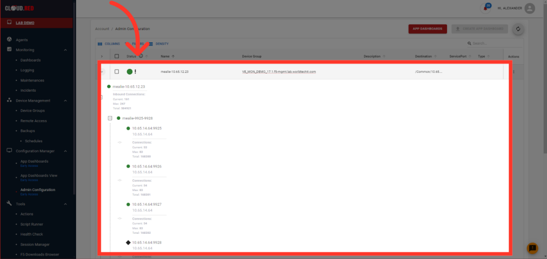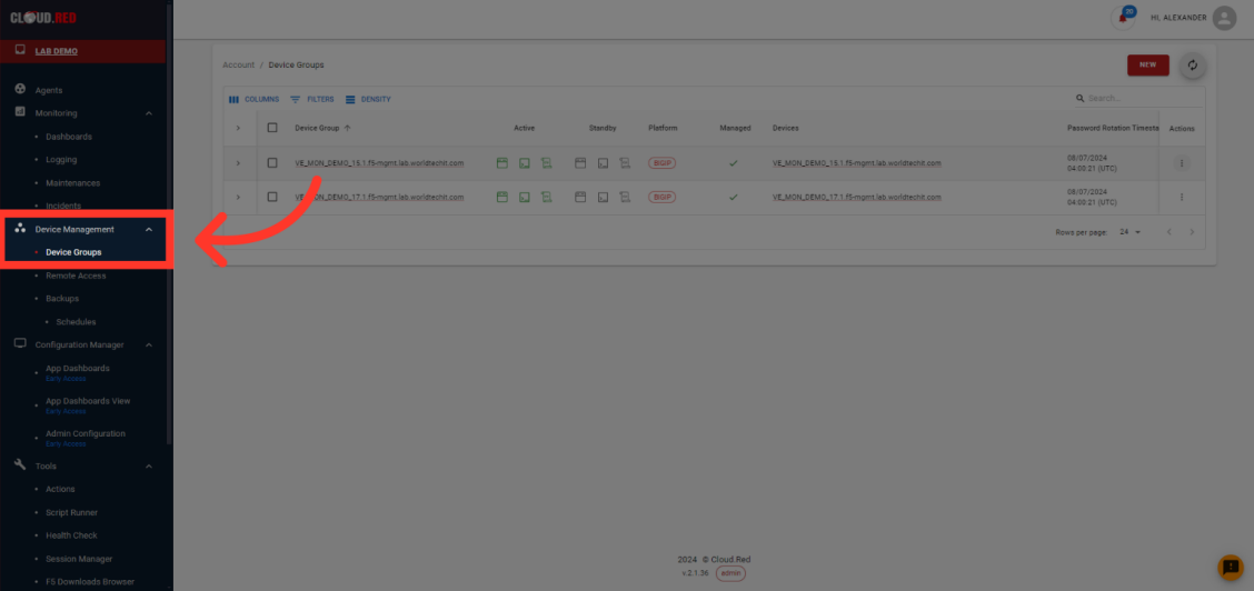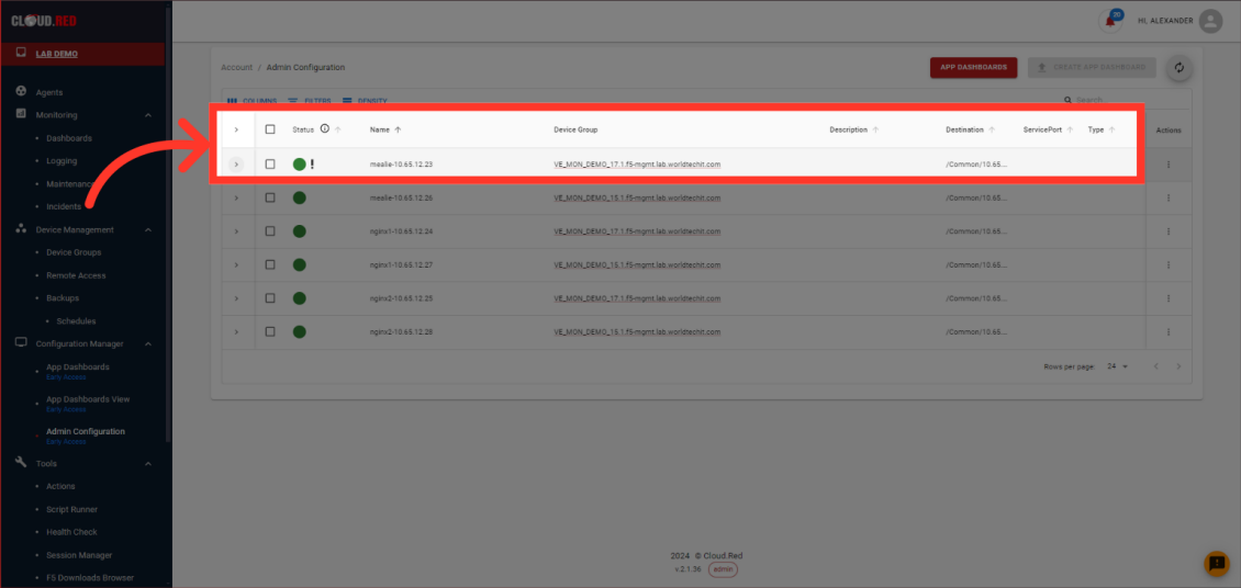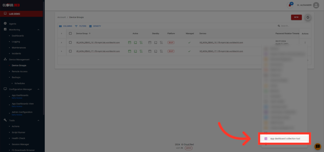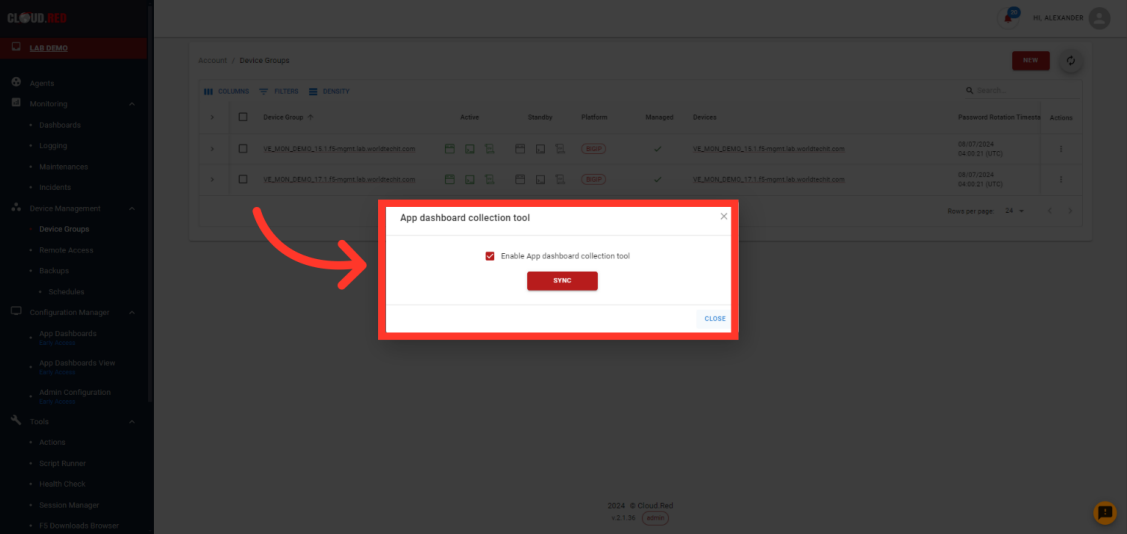By Default, App Dashboards is not enable. Once the feature is enabled, it will poll virtuals and any configured sub components on all devices in that device group. App Dashboards will poll the device during the backup process or on demand. To limit impact on the devices, the discovery is performed sequentially.- To enable this feature, navigate to the “device management” Tab in the left-hand navigation.