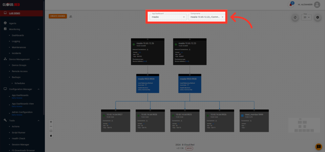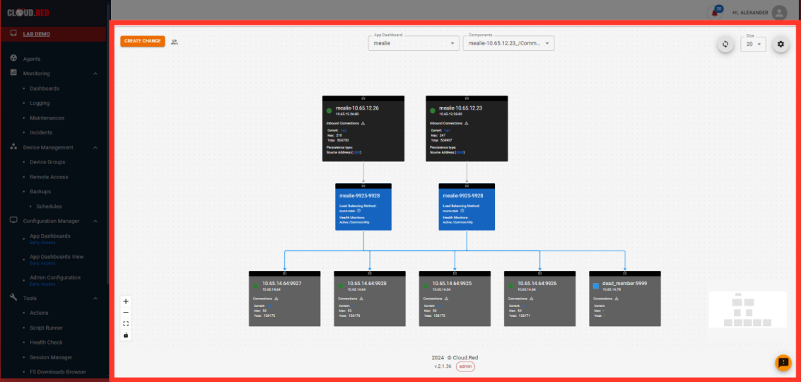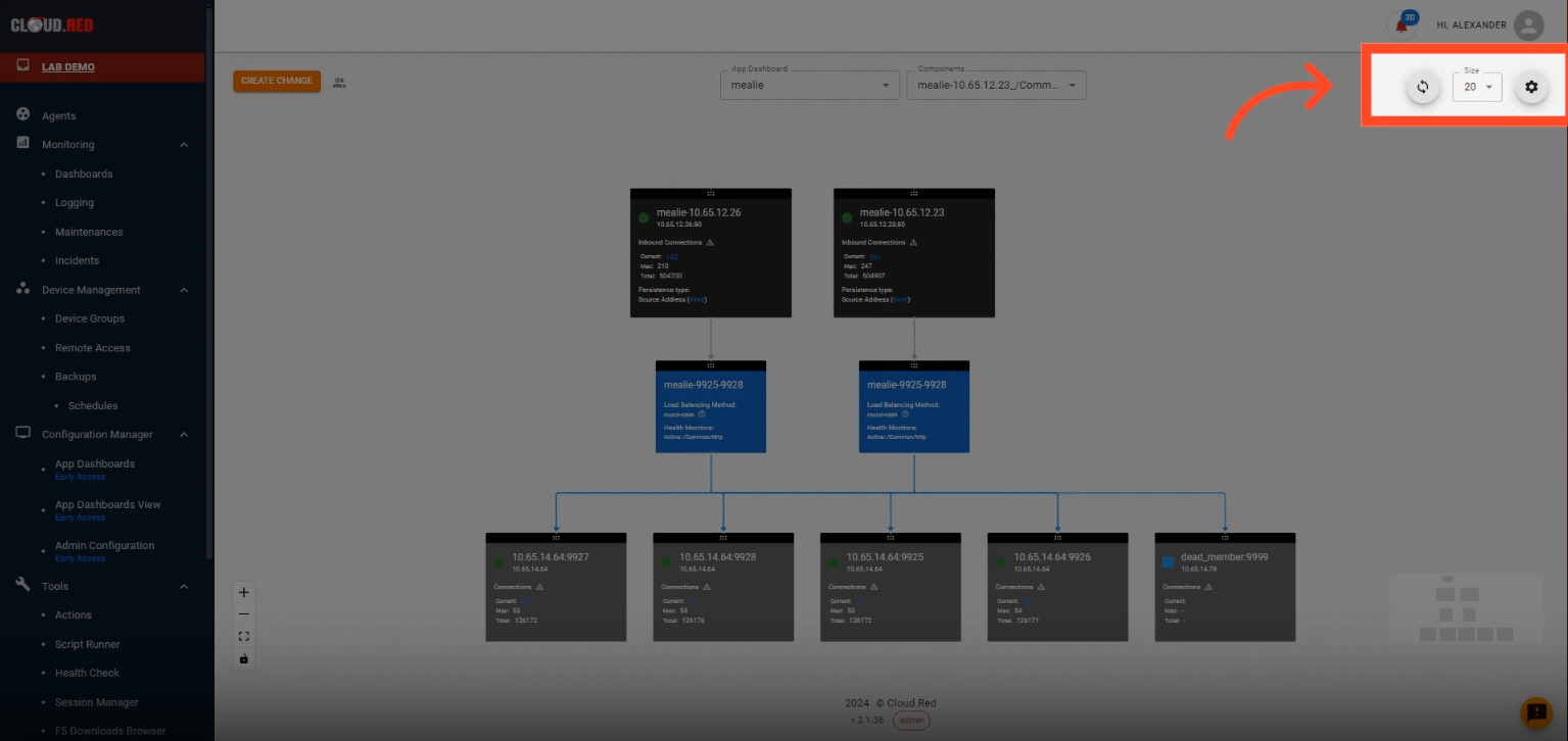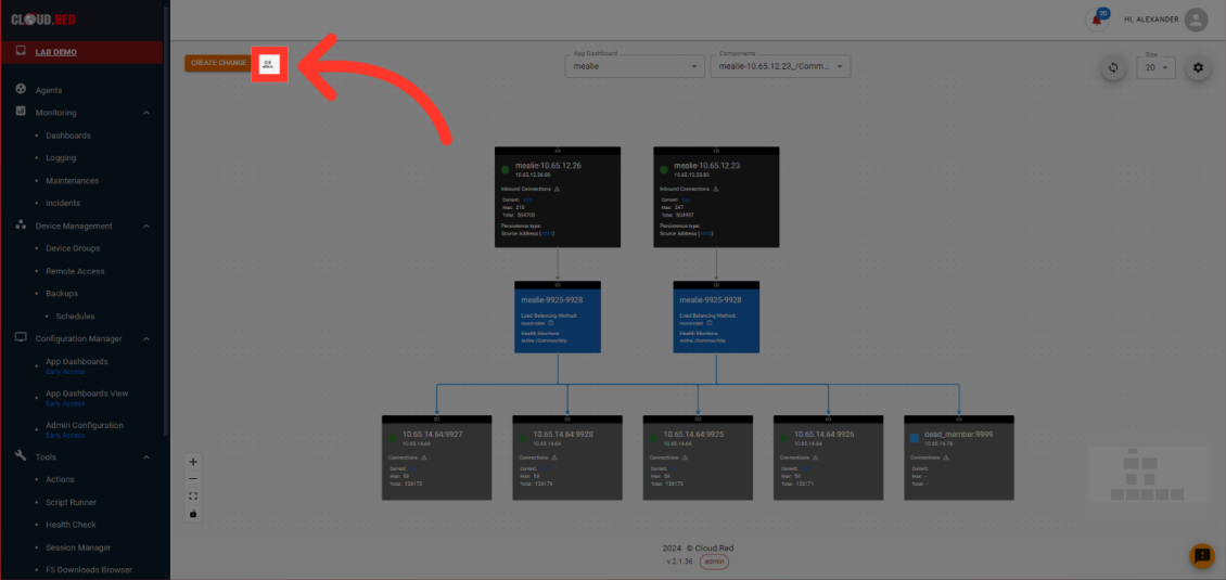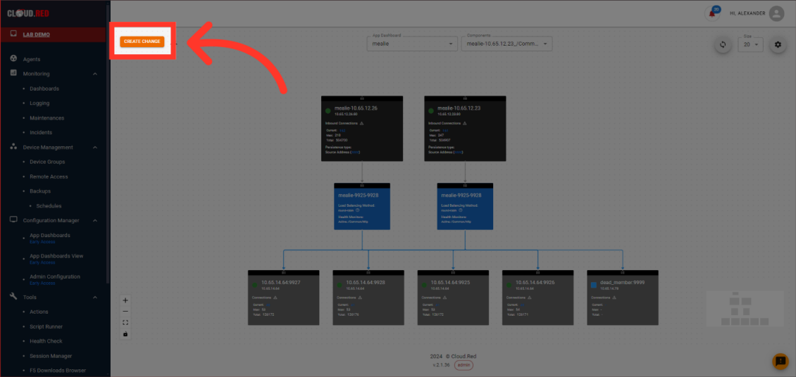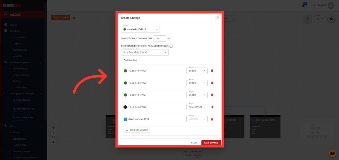 Users can quickly change the configuration of their pools by editing the slow ramp time or connection behavior on pool member down. Users are able to quickly add, remove, or change the state of pool members.- To edit the configuration, Select the “Create Change” button.