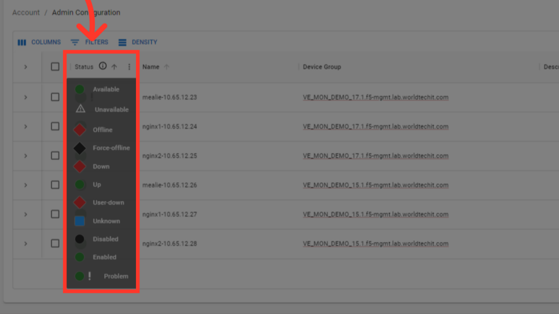 - In Admin Configuration, administators can view a list of all VIPs that are being poled. Administrators are provided the status, name, device group, a description, the destination, the service port, and type.