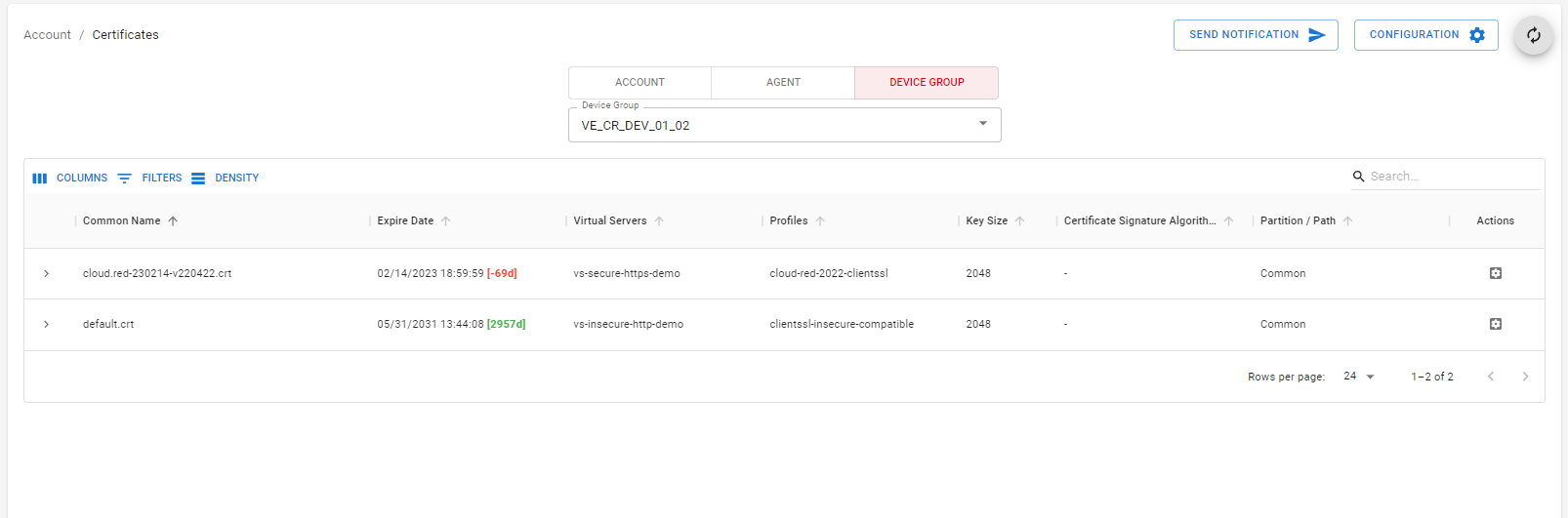 Configuration of certificates available to the tool is handled at the device group level.To modify a device group’s certificate management configuration, go to the device groups tab and select configuration in the top right corner.