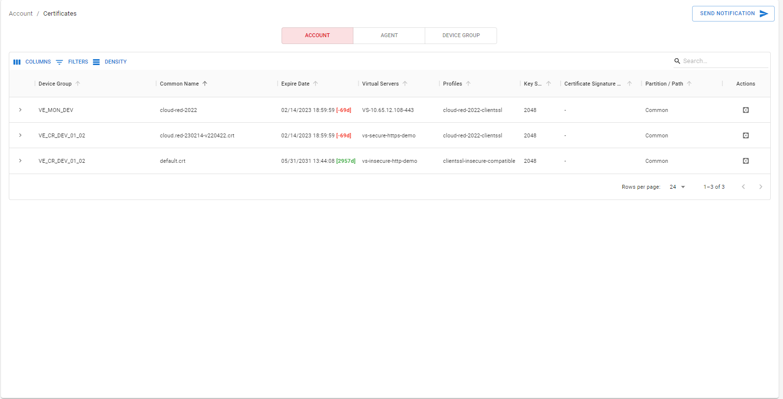 The tool shows managed certificates, listed by Account, Agent, or Device Group.