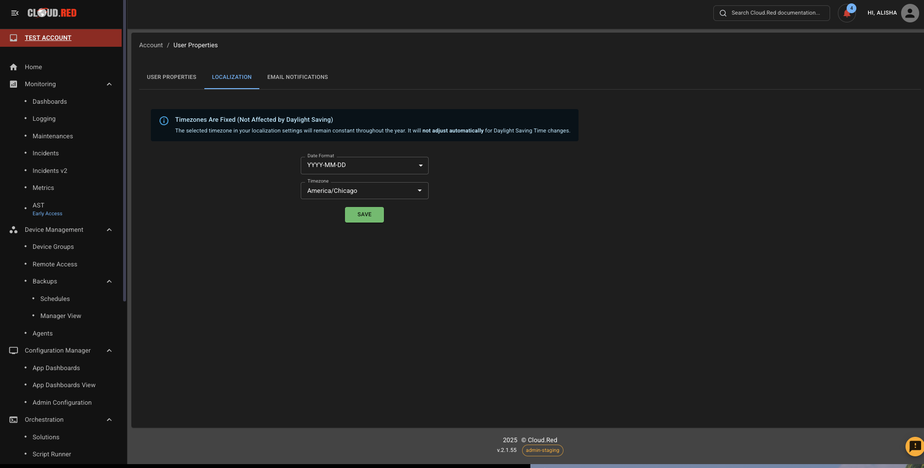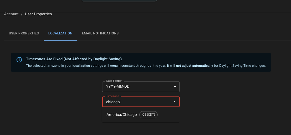 The time zone set will be reflected throughout the platform for all timestamps, graphs, or scheduling features.